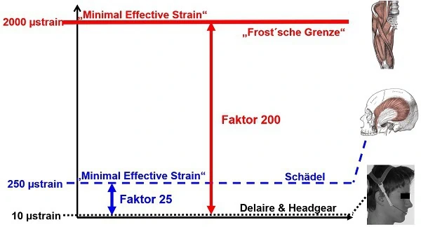 Erstaunlicherweise hat die biomechanische Analyse der, durch einen Headgear induzierten mechanischen Signale, im Bereich der Suturen relativ niedrige Knochendehnungen ergeben. Diese liegen in der Regel um die 10 bis 15 microstrain und damit um den Faktor 200 unterhalb der sogenannten “Frost´schen Grenze”, ab der mit den entsprechenden Reaktionen auf zytologischer Ebene zu rechnen ist.